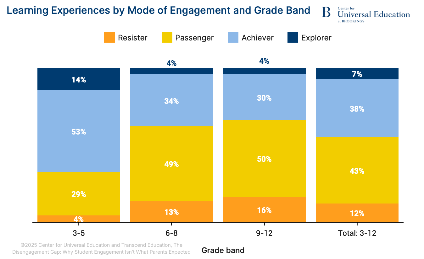 Our Brookings–Transcend study found that fewer than 4% of students in middle and high school regularly had in-school experiences that supported Explorer mode.